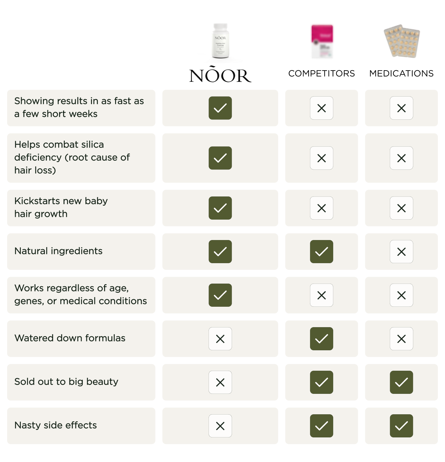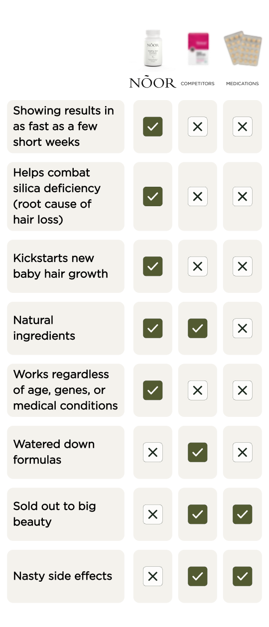 Noor has a strong ingredient found in a special type of rosemary called HorseTail Extract. When the body gets Silica the right way, our hair follicles can work right again… So hair growth can be restored.*